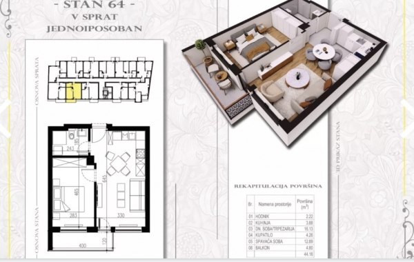 Prodaje se 2s stan u izgradnji, na Radijalcu, površine 44.16m2, na 5. spratu. Stan se sastoji od komforne spavaće sobe, dnevnog boravka sa kuhinjom i trpezarijom, kupatila i terase. Podne obloke tarket parket i prvoklasna keramika, grejanje gasno-na radijatore, pvc stolarija, unutrašnjost bela, spolja antracit boja, aluminijumske roletne. Zgrada je građena od veoma kvalitetnih materijala, po visokim standardima, sa odličnom zvučnom i toplotnom izolacijom. Pozicionirana je na izuzetnoj lokaciji, u mirnoj ulici, a na samo par minuta hoda do svog potrebnog sadržaja, pijace, škole, vrtića, marketa, šetališta. Predviđeni rok završetka jul 2026. godina. Uz stan je obavezno i garažno mesto, po ceni od 15.000e.